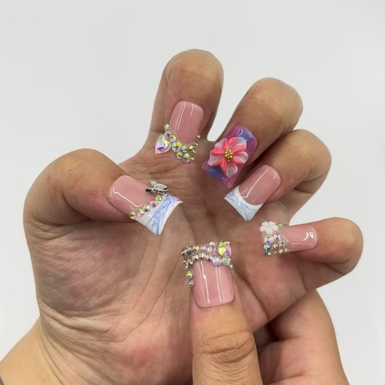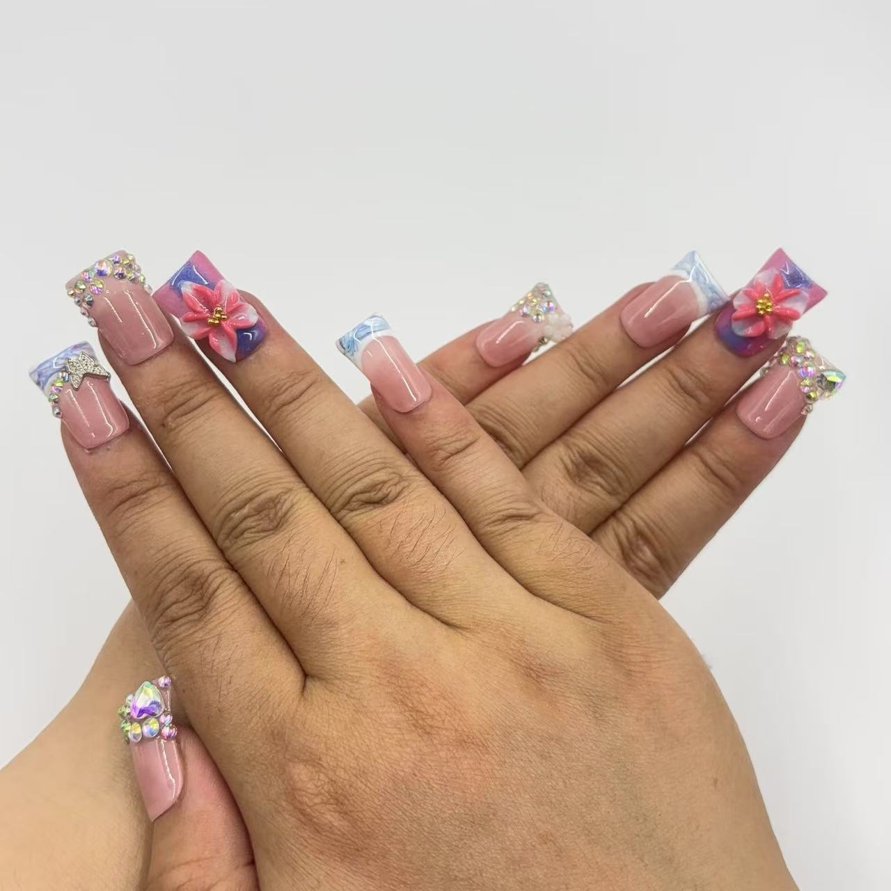 Discover the beauty of our meticulously crafted handmade nail art. These nails feature a harmonious blend of soft nude - pink hues paired with vibrant accents like cool blue, deep green, and rich brown. Adorned with delicate flower decorations, shimmering gemstones, and elegant gold...