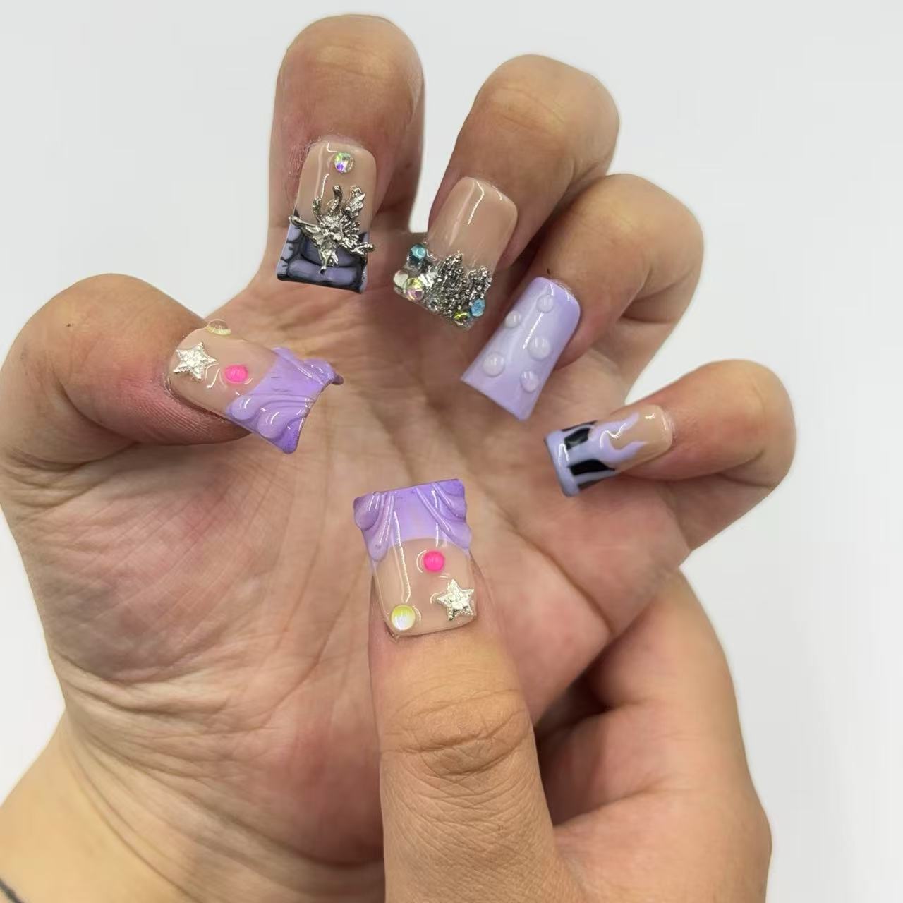 Lavender Mix Duck Nails feature square shapes with lavender, light pink, and ink - like patterns. 3D silver...
