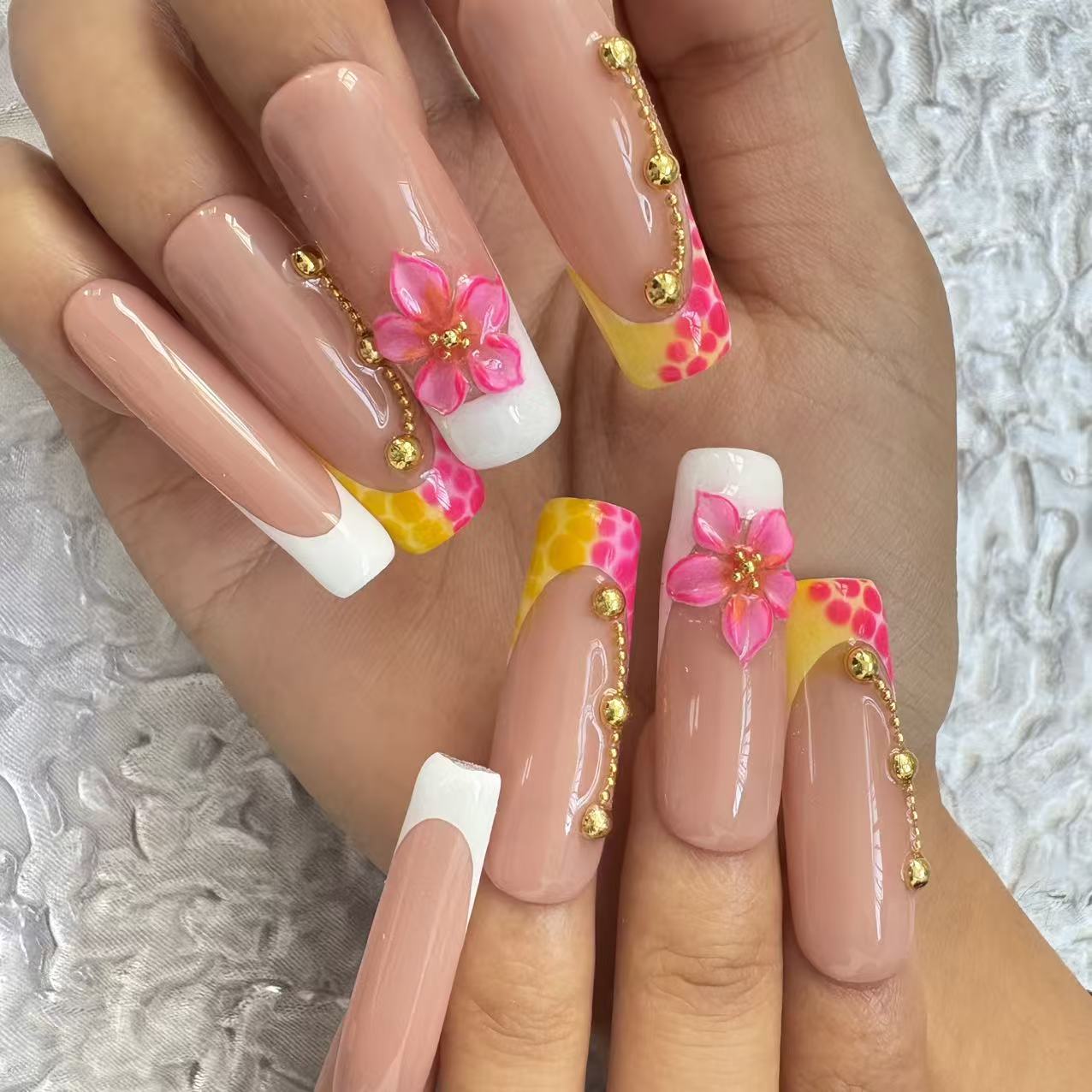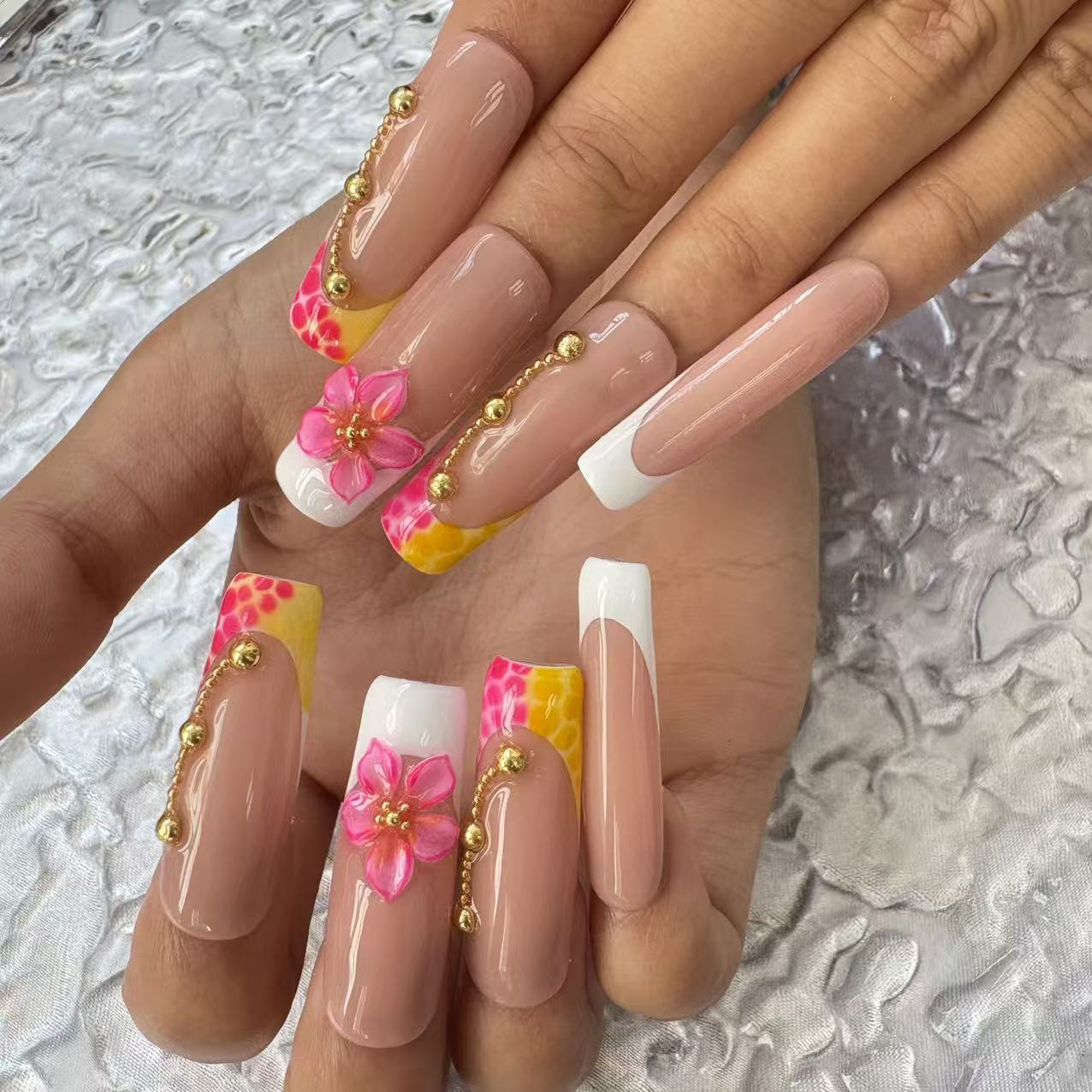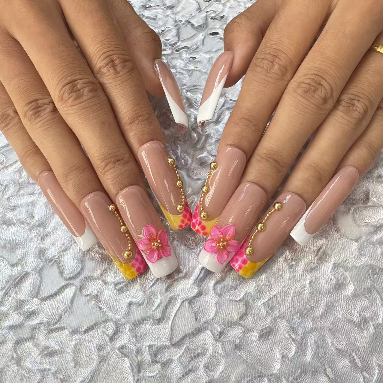 Chic Nude Pink Handmade Press - On Nails with Floral & Gold Bead Embellishments D050