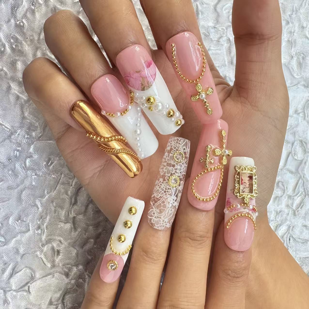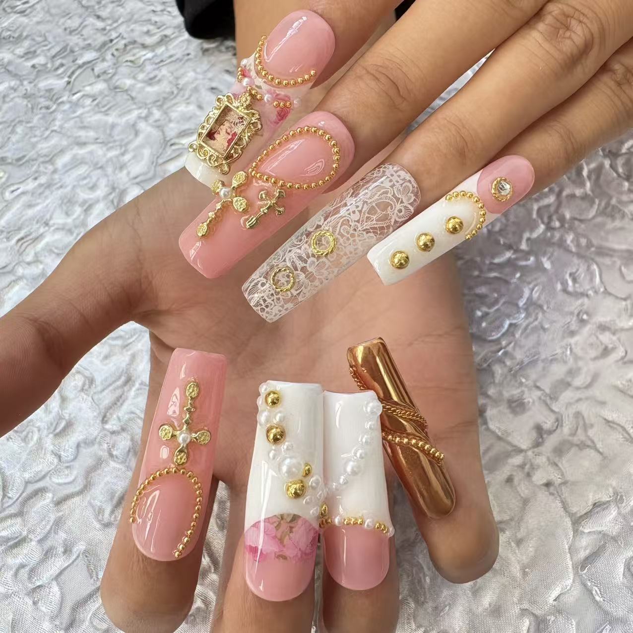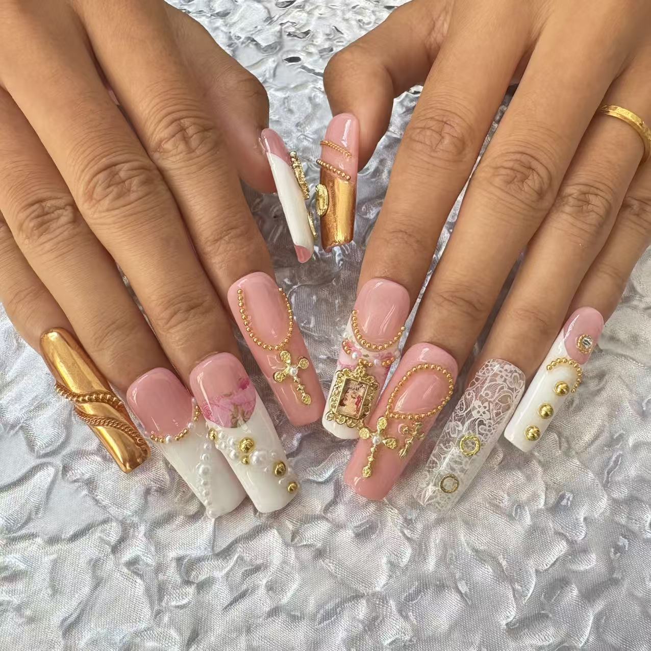 Vintage Baroque Pink Gold 3D Nail Art with Religious & Pearl Accents - Handmade Press - On NailsD049