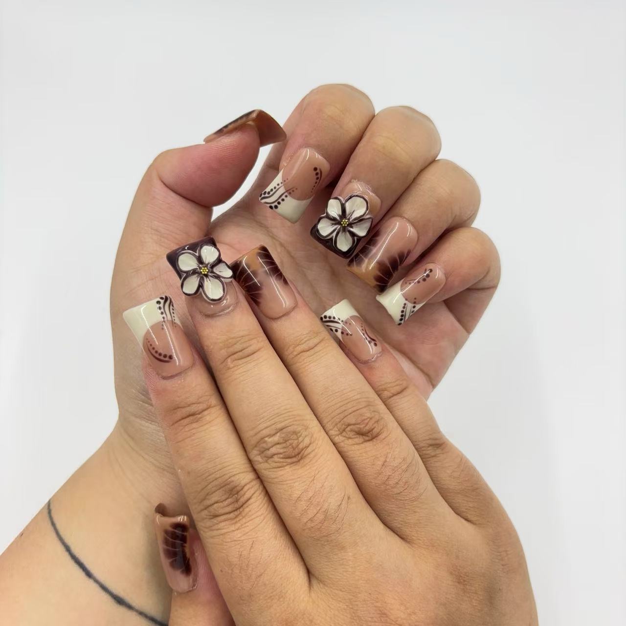 Elegant Blossom duck nails feature a nude base with brown gradients. The white French tips add a classic...