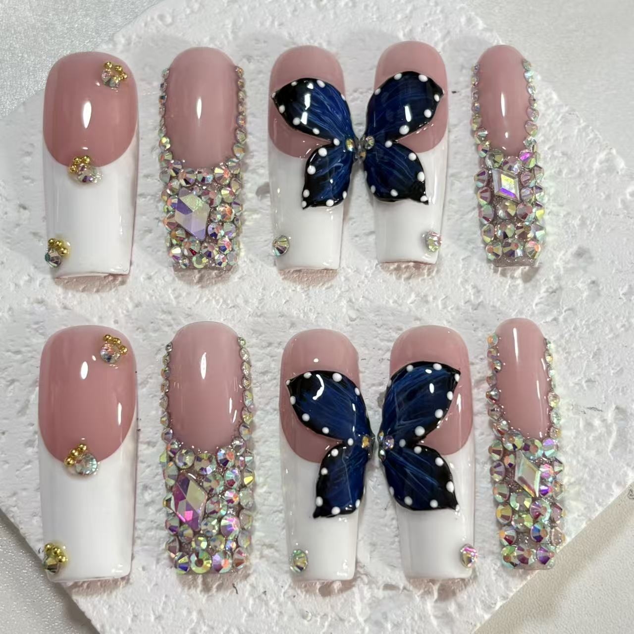 Enchanting Handmade Pink - White Nail Art with Butterfly and Crystal Embellishments D067