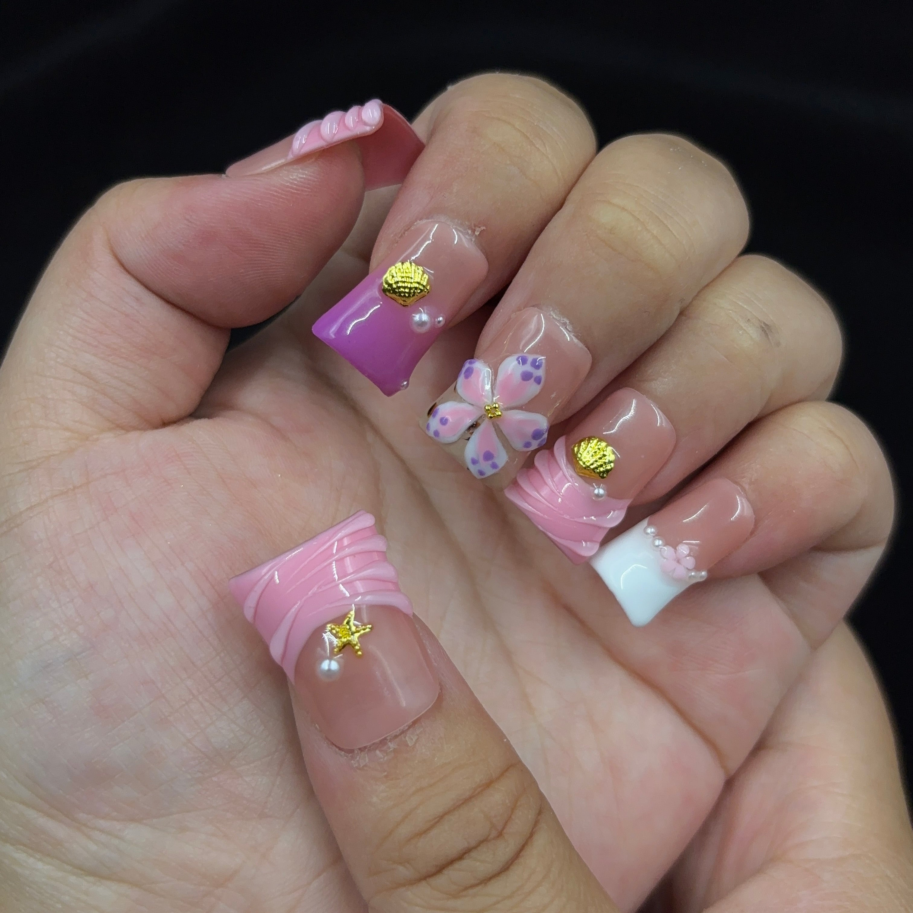 Discover the beauty of our meticulously crafted handmade nail art. These nails feature a harmonious blend of soft nude - pink hues paired with vibrant accents like cool blue, deep green, and rich brown. Adorned with delicate flower decorations, shimmering gemstones, and elegant gold...
