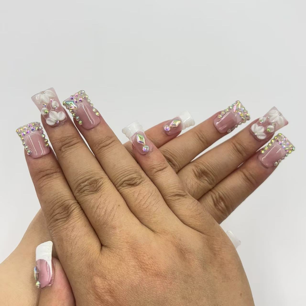 Chic Handmade French - Style Nail Art with Floral and Crystal Embellishments D074Chic Handmade French - Style Nail Art with Floral and Crystal Embellishments D074