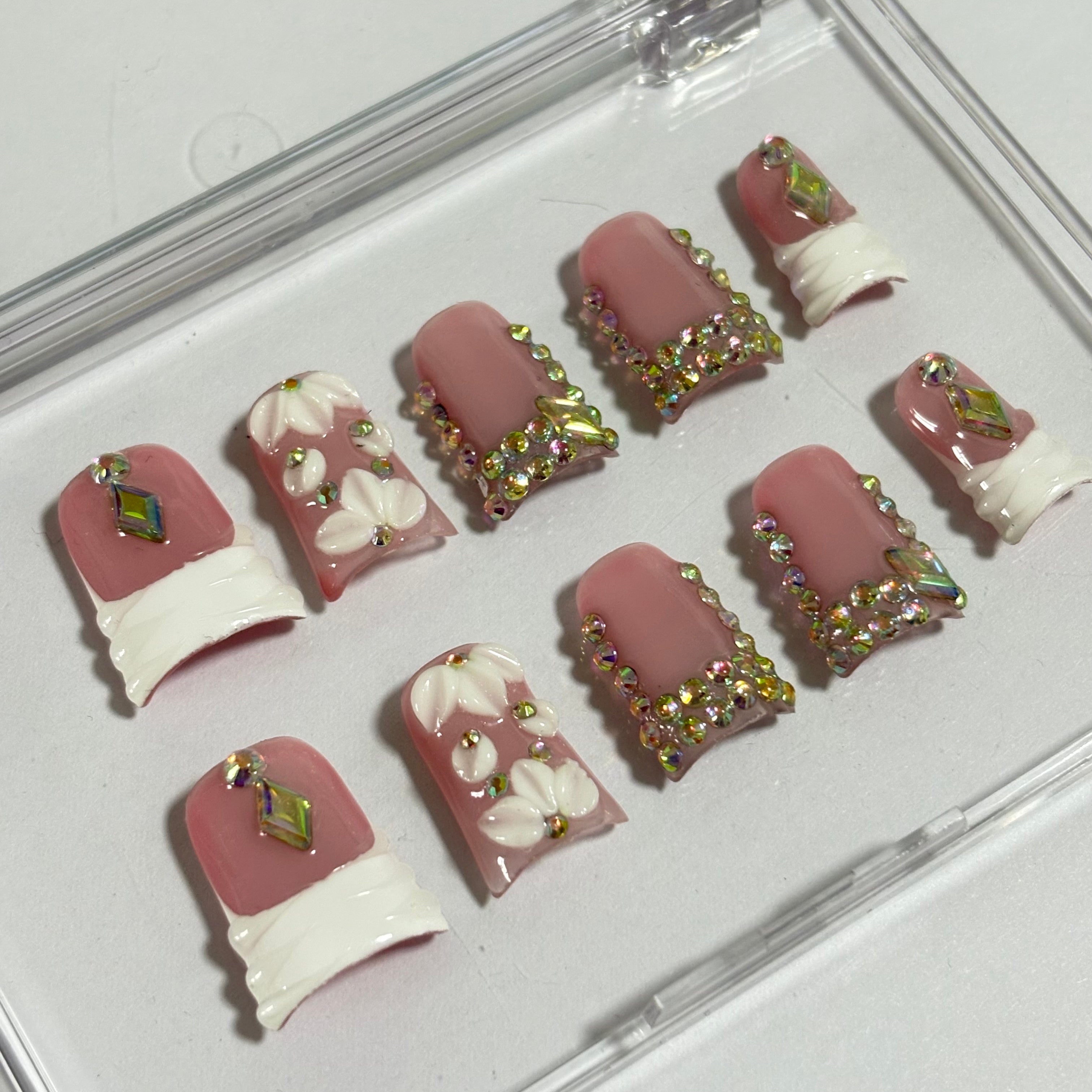 Chic Handmade French - Style Nail Art with Floral and Crystal Embellishments D074