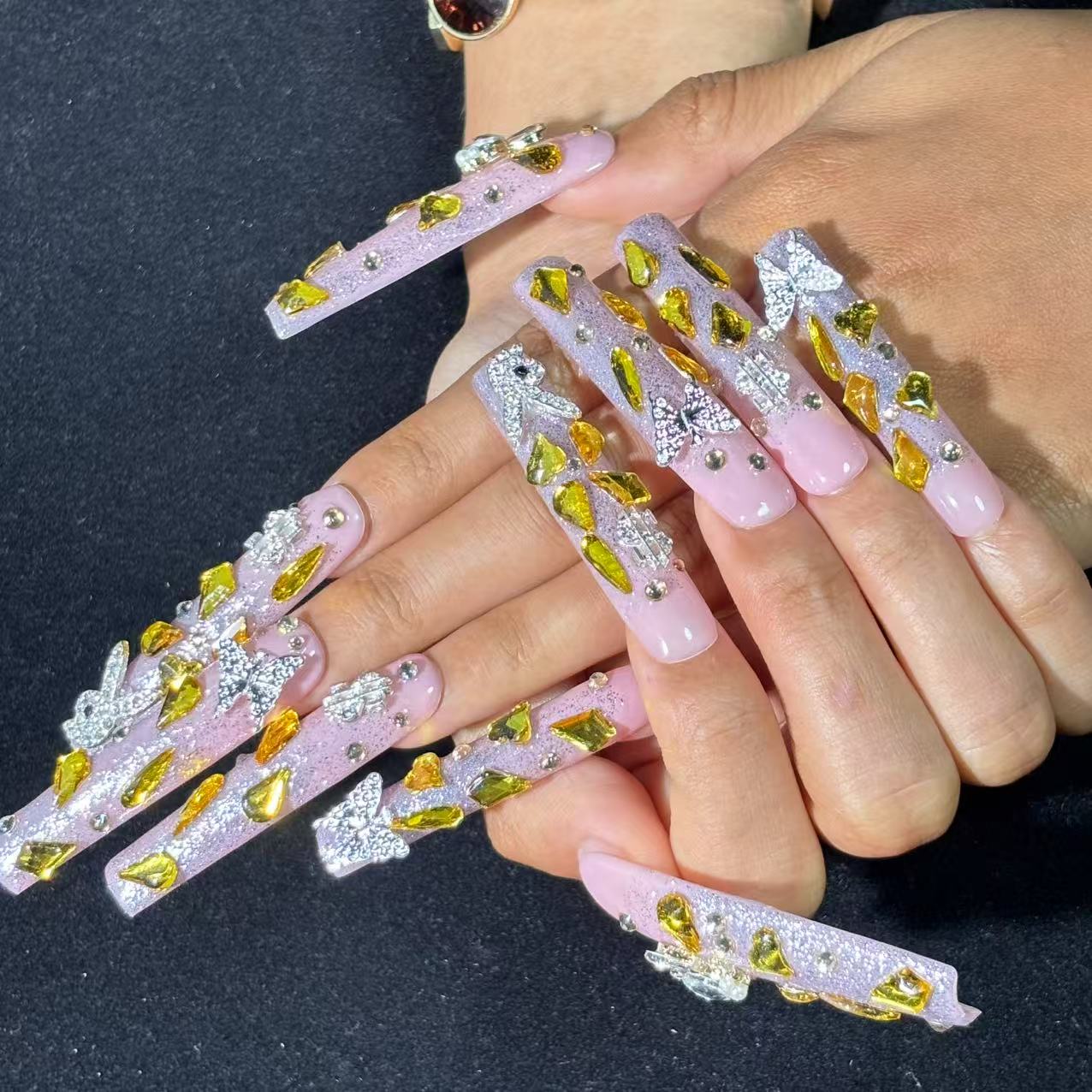 Long - tapered handmade nails blend golden and silver hues, featuring hand - set firework - cut...