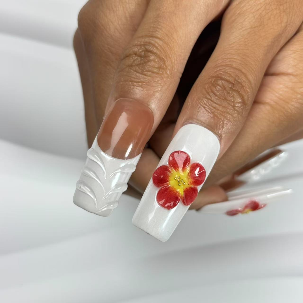 Chic Handmade French - Style Nail Art with Floral and Crystal Embellishments D074Chic Handmade French - Style Nail Art with Floral and Crystal Embellishments D074
