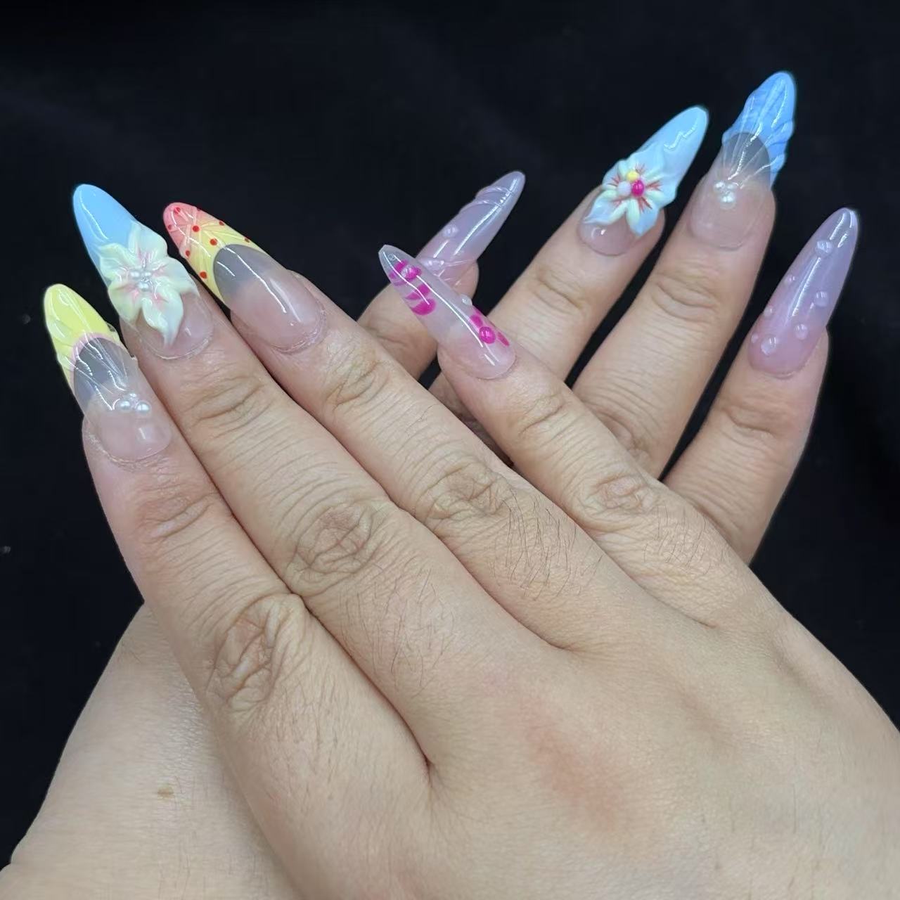 Exquisite Handmade Multicolored Nail Art with Floral and Gemstone Embellishments D051Exquisite Handmade Multicolored Nail Art with Floral and Gemstone Embellishments D051