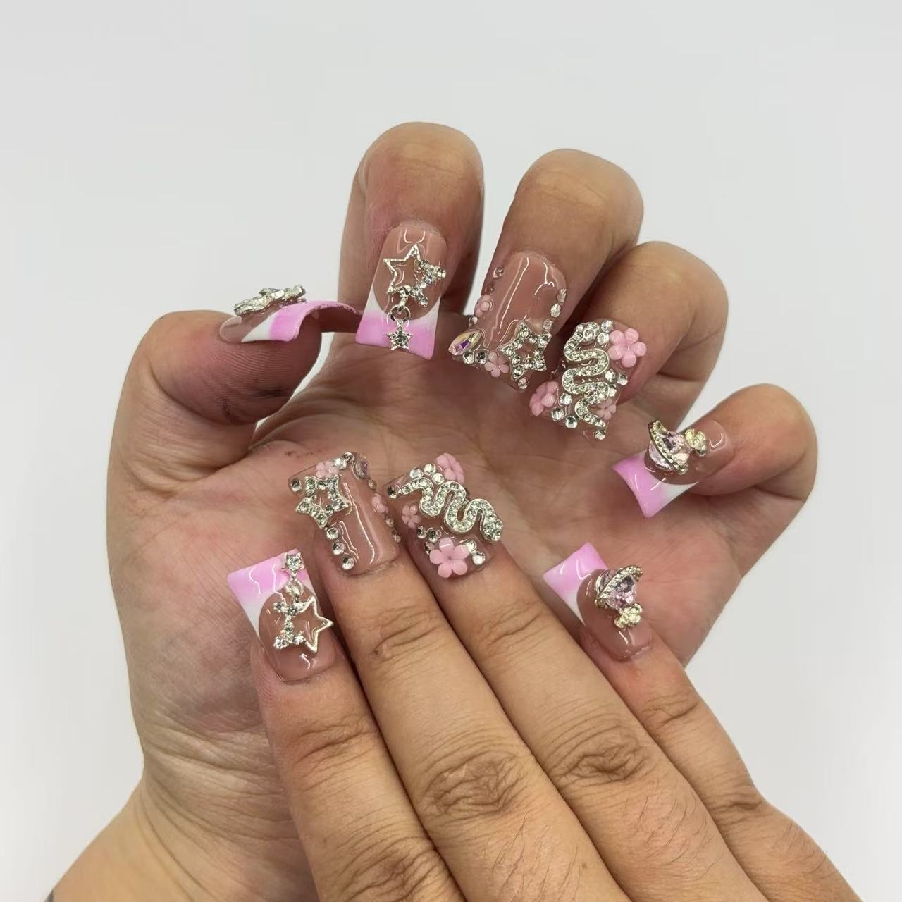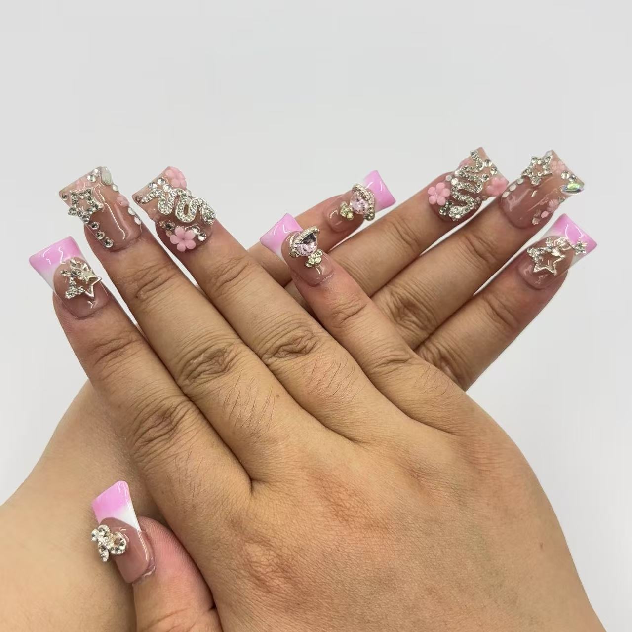 Chic Handmade French - Style Nail Art with Floral and Crystal Embellishments D074Chic Handmade French - Style Nail Art with Floral and Crystal Embellishments D074