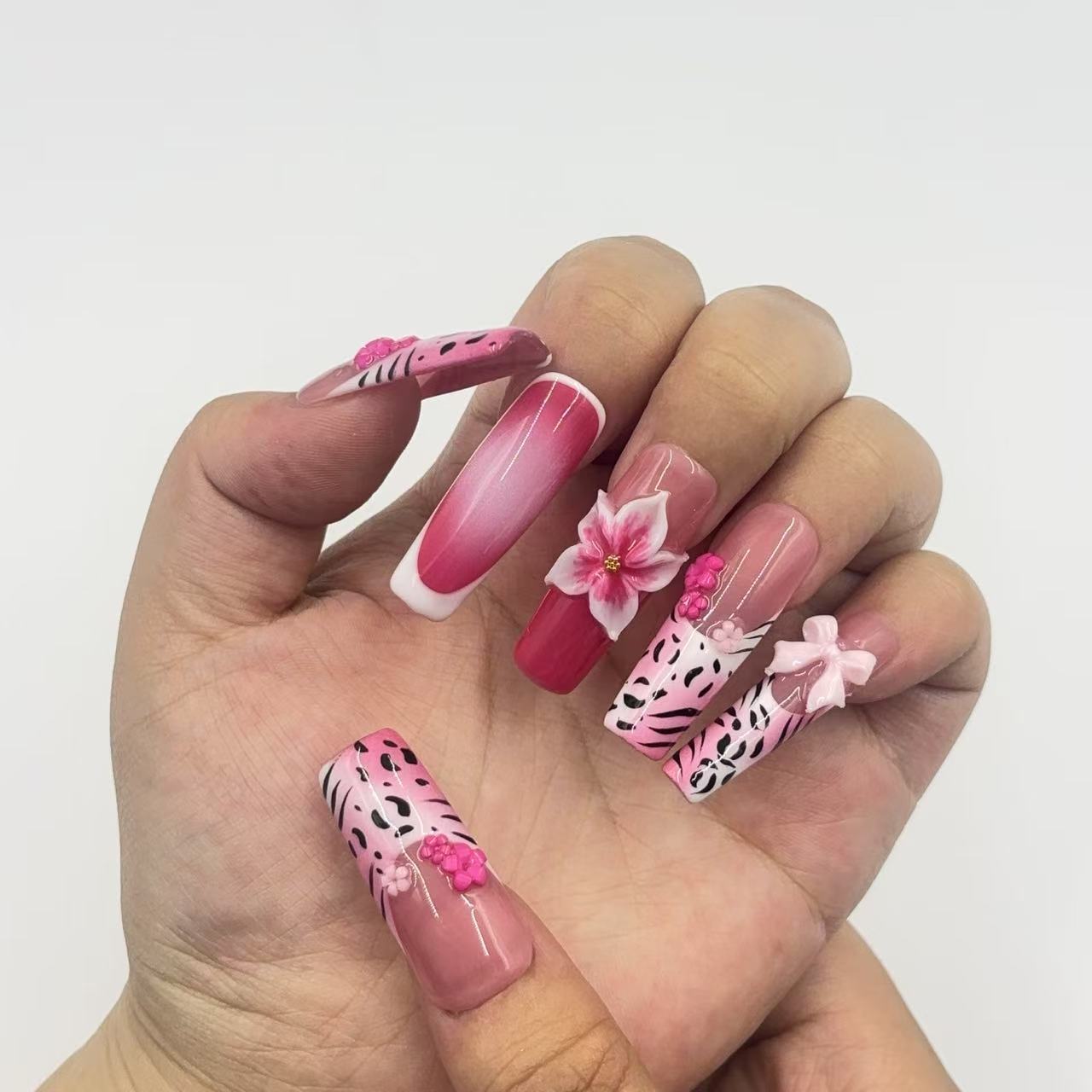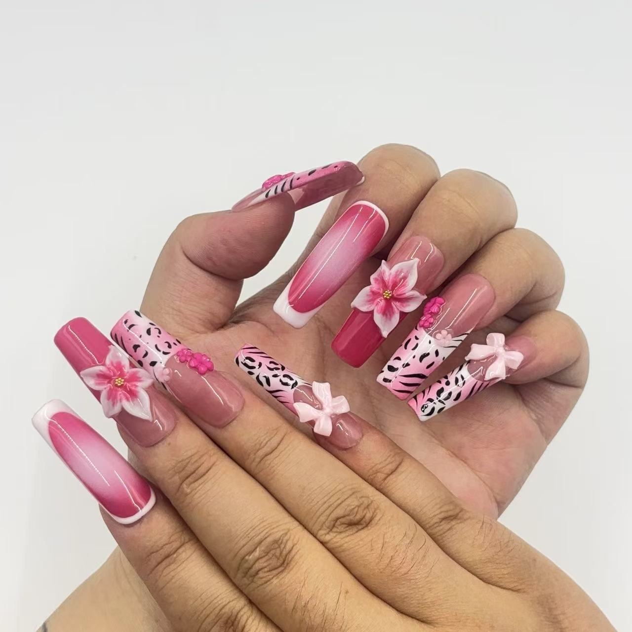 Pink Panther Sweet Handmade Nails feature pink gradient bases with white French tips and pink leopard patterns. The...