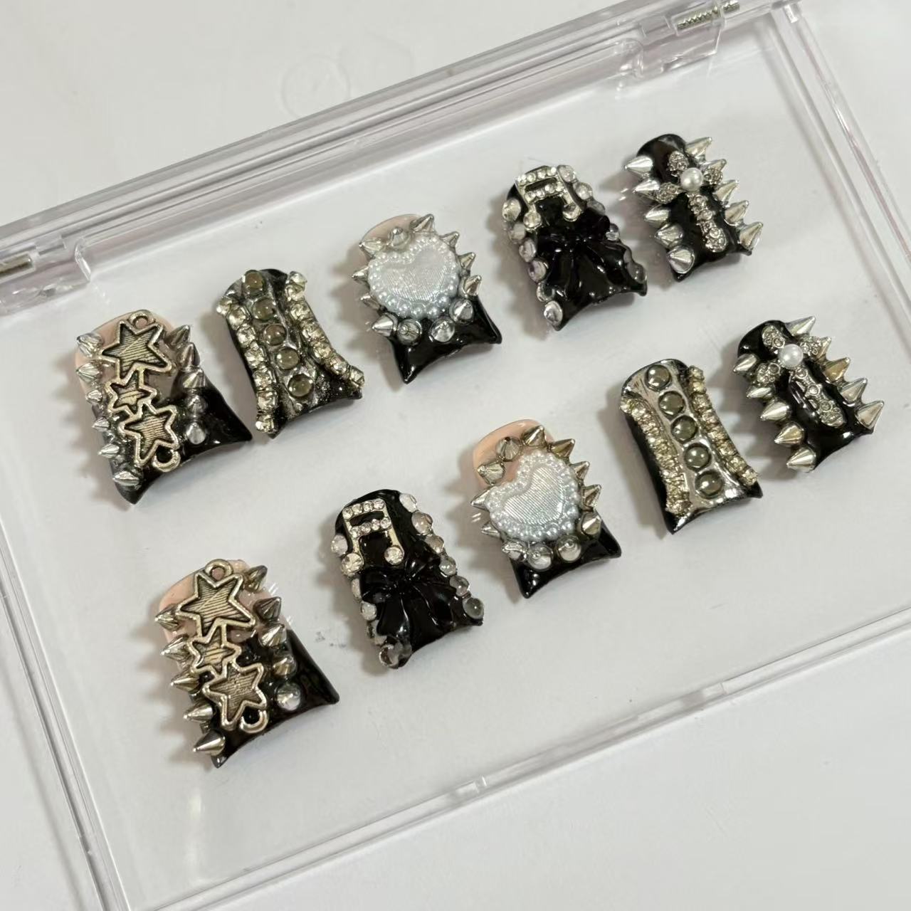 Step into sophistication with these meticulously crafted handmade press - on nails. The design harmoniously marries sleek black with a soft nude shade, creating a timeless and striking contrast. Gold - toned bows add a touch of luxury and femininity, while clusters of black...