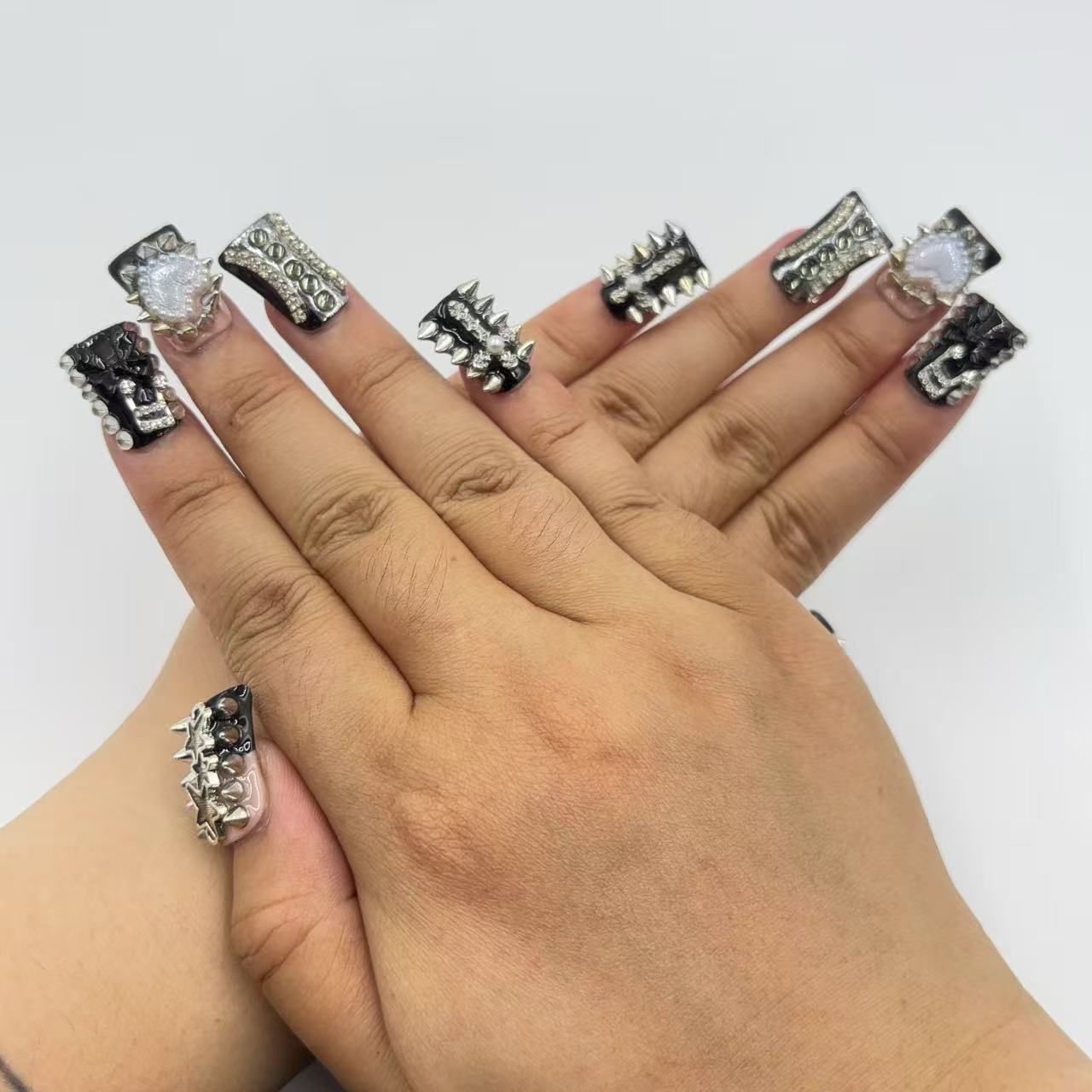 Punk - Glam Duck Nails fuse 3D - carved silver studs, spikes, and rhinestone accents on a...