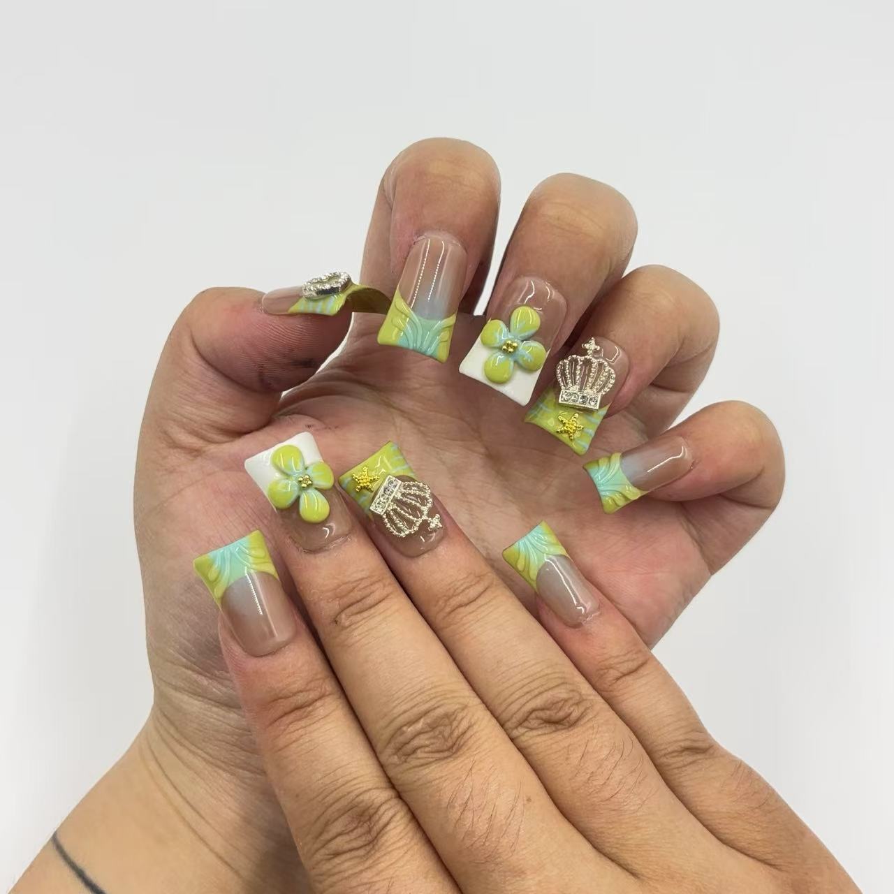 Discover the beauty of our meticulously crafted handmade nail art. These nails feature a harmonious blend of soft nude - pink hues paired with vibrant accents like cool blue, deep green, and rich brown. Adorned with delicate flower decorations, shimmering gemstones, and elegant gold...