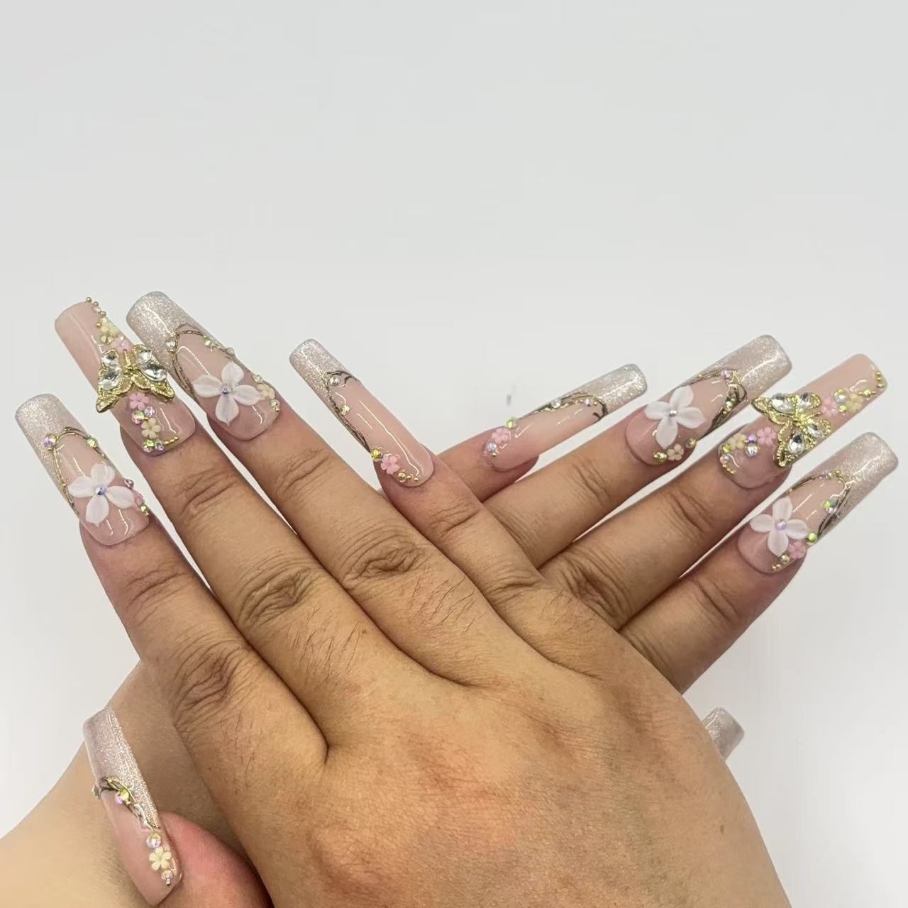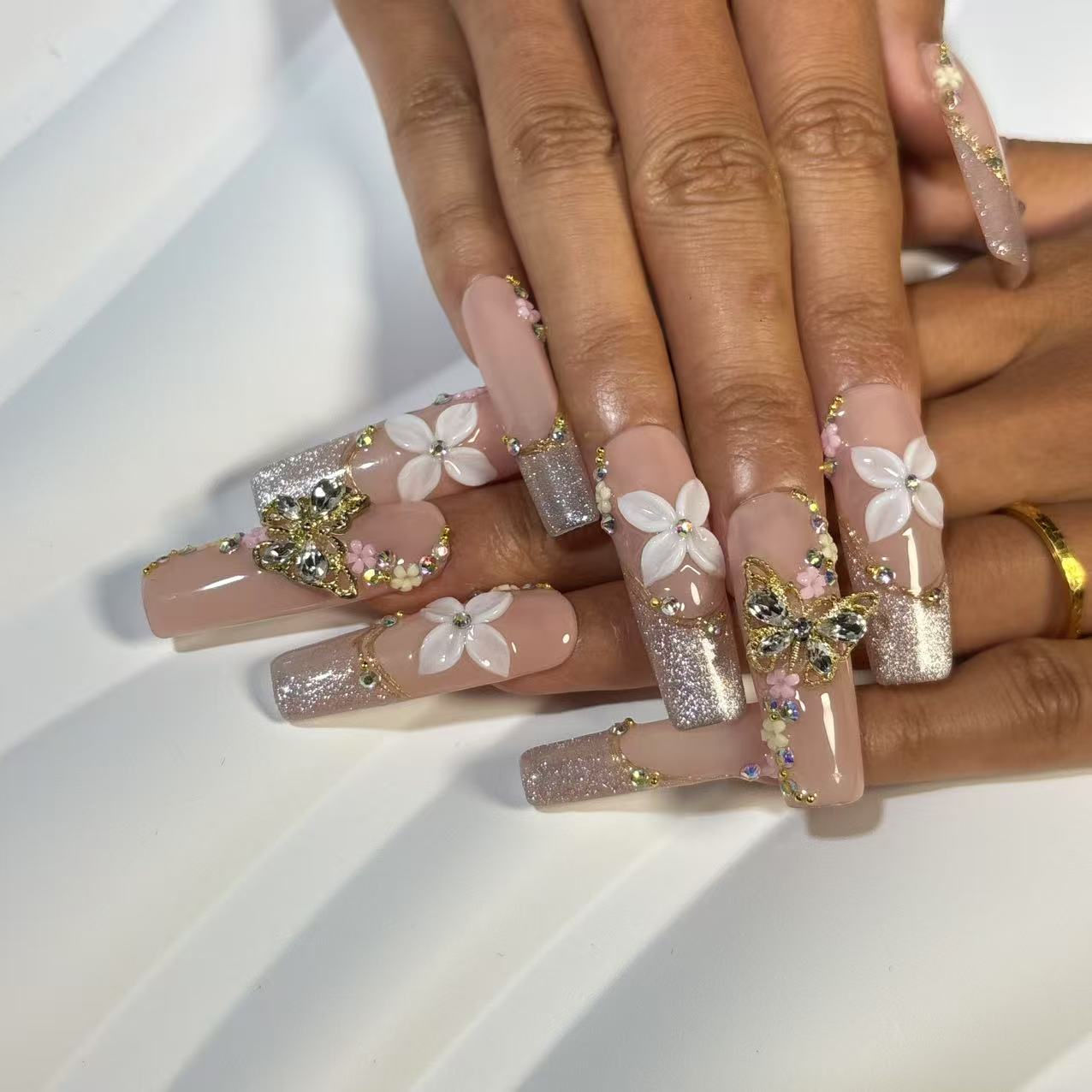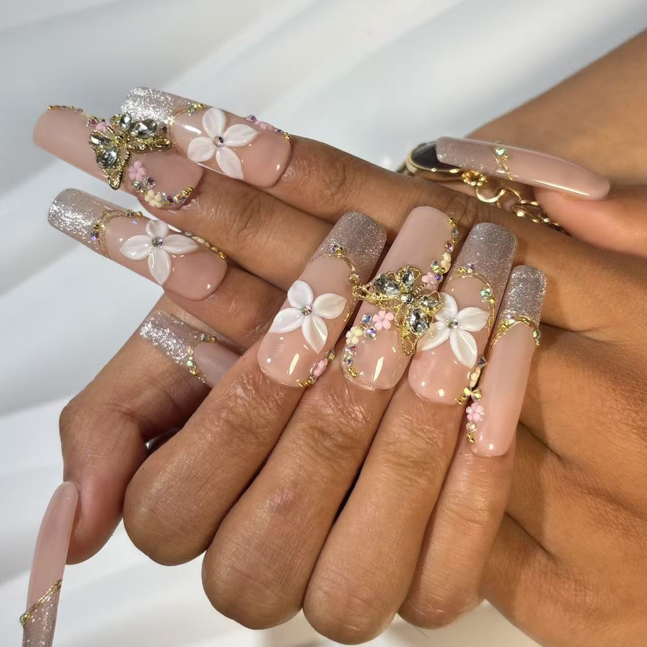 Chic Handmade French - Style Nail Art with Floral and Crystal Embellishments D074Chic Handmade French - Style Nail Art with Floral and Crystal Embellishments D074