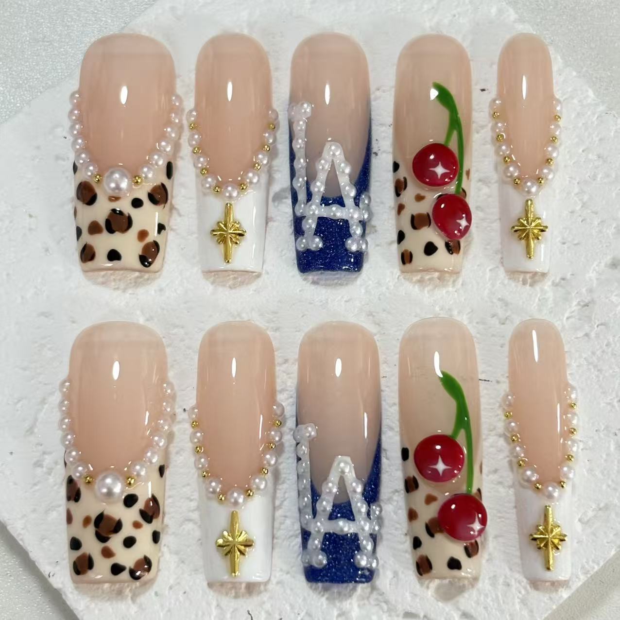 Stylish Handmade Nail Art: Nude - Inspired Designs with Leopard Print, Cherry and Pearl Embellishments D072