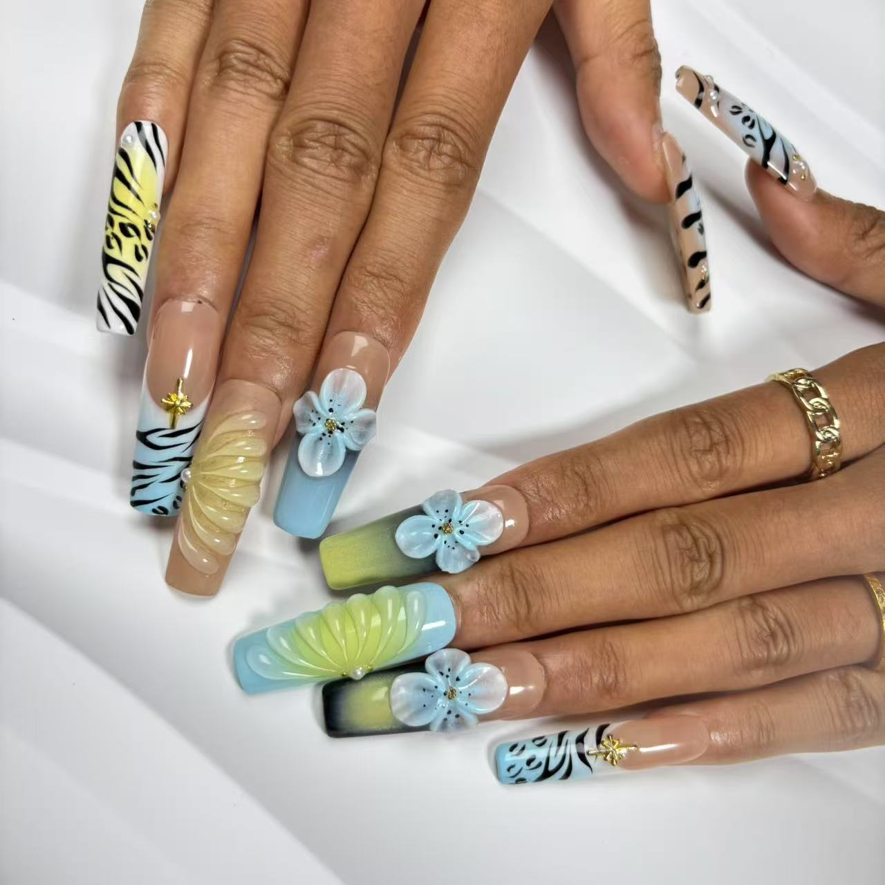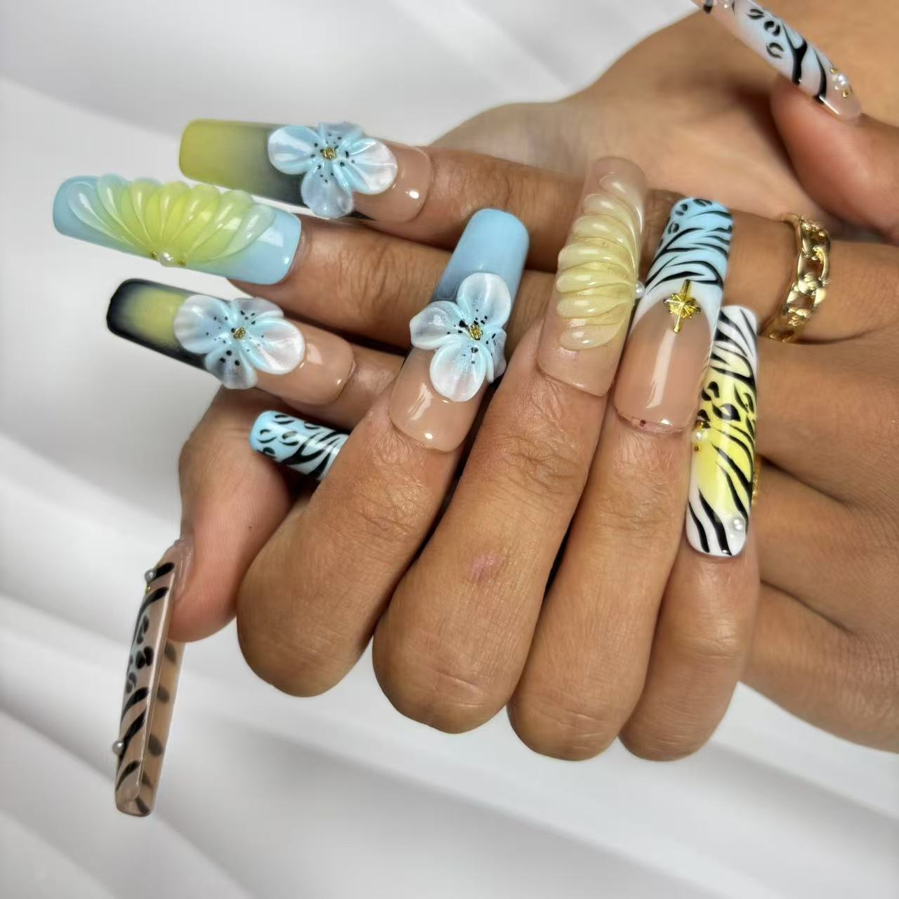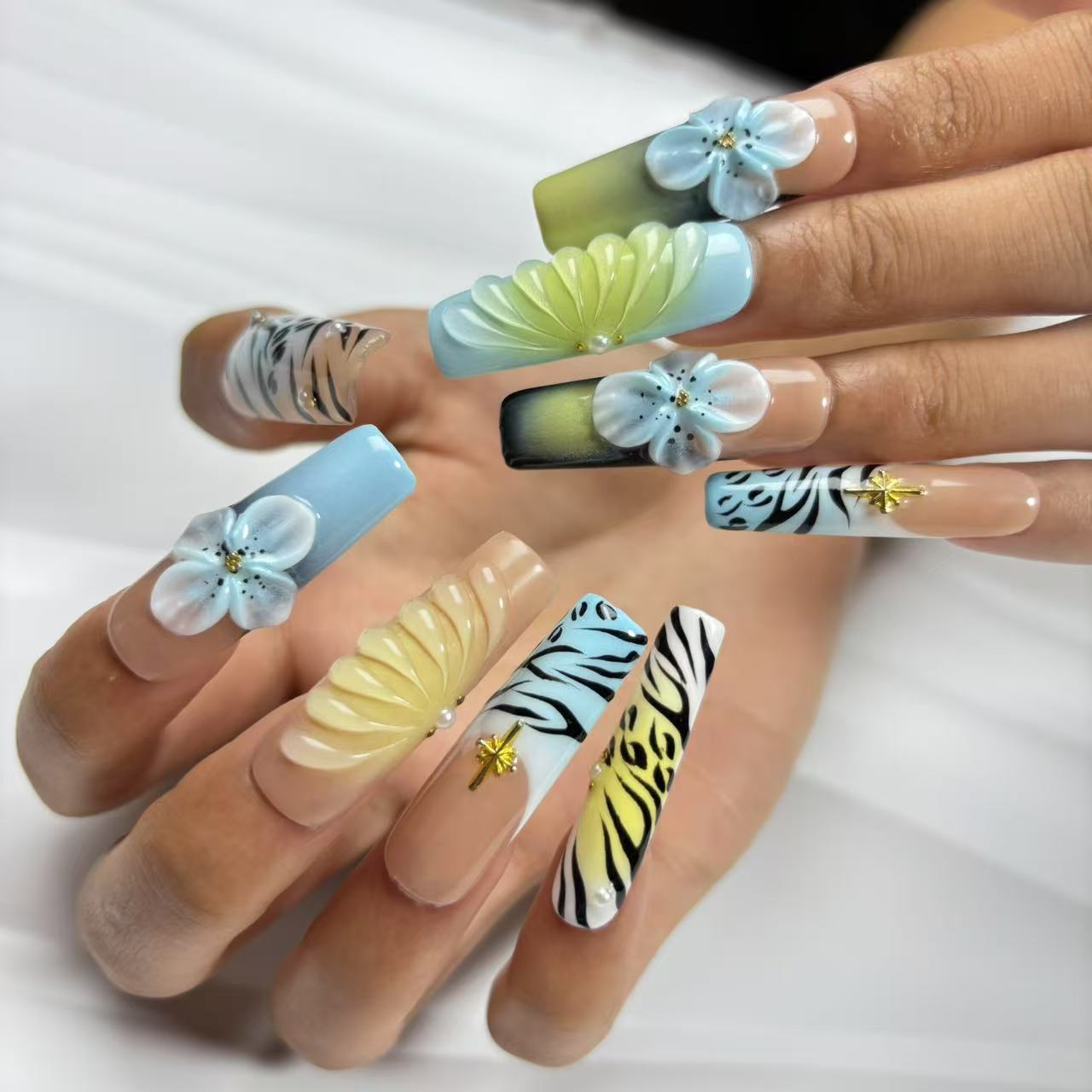 Long - tapered handmade nails blend safari - inspired prints (zebra, leopard), 3D floral accents, and gradient...